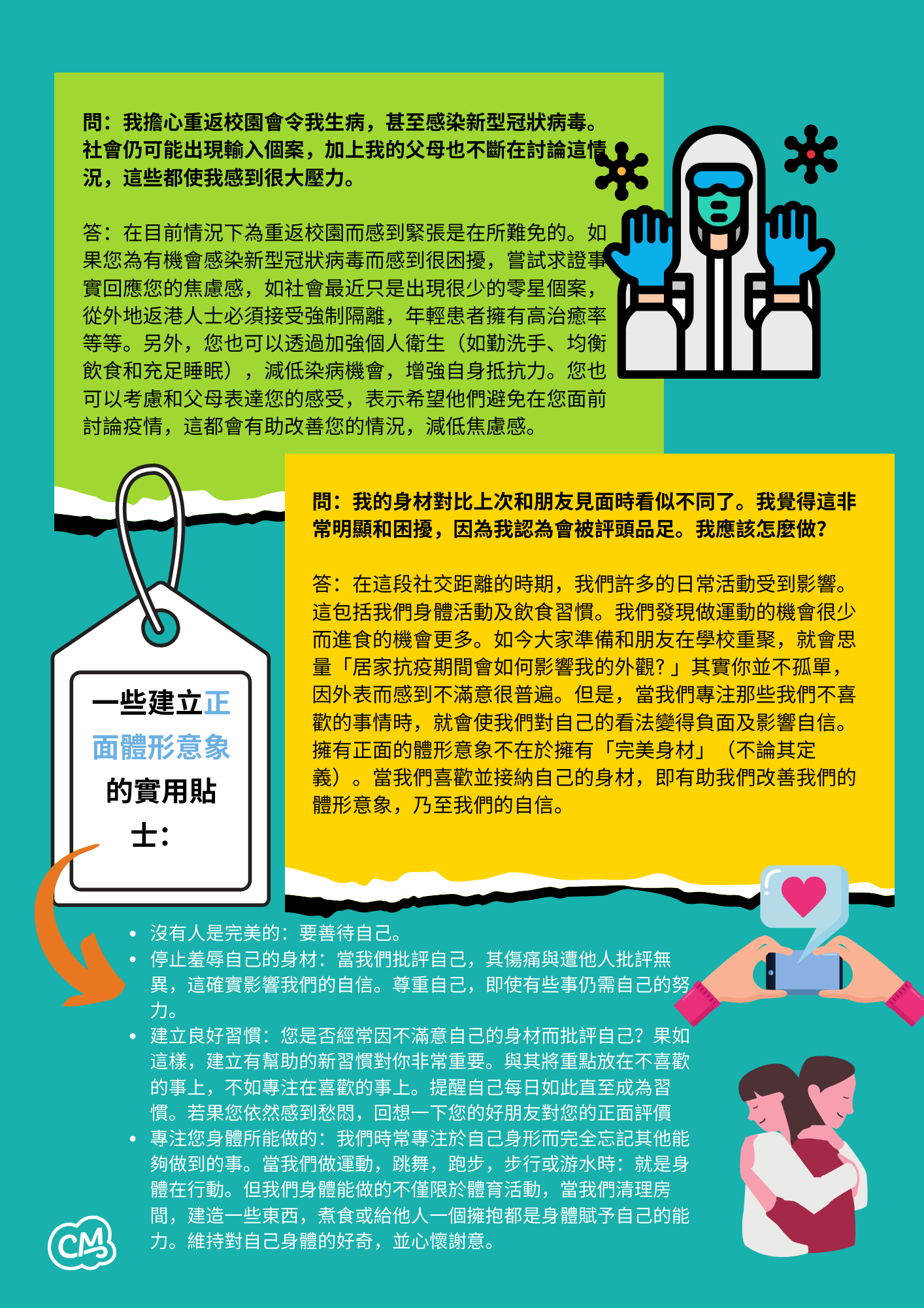 答:在這段社交距離的時期,我們許多的⽇常活動受到影響。這包括我們⾝體活動及飲⻝習慣。我們發現做運動的機會很少⽽進⻝的機會更多。如今⼤家準備和朋友在學校重聚,就會思量「居家抗疫期間會如何影響我的外觀? 」其實你並不孤單,因外表⽽感到不滿意很普遍。但是,當我們專注那些我們不喜歡的事情時,就會使我們對⾃⼰的看法變得負⾯及影響⾃信。 擁有正⾯的體形意象不在於擁有「完美⾝材」(不論其定義)。當我們喜歡並接納⾃⼰的⾝材,即有助我們改善我們的體形意象,乃⾄我們的⾃信。