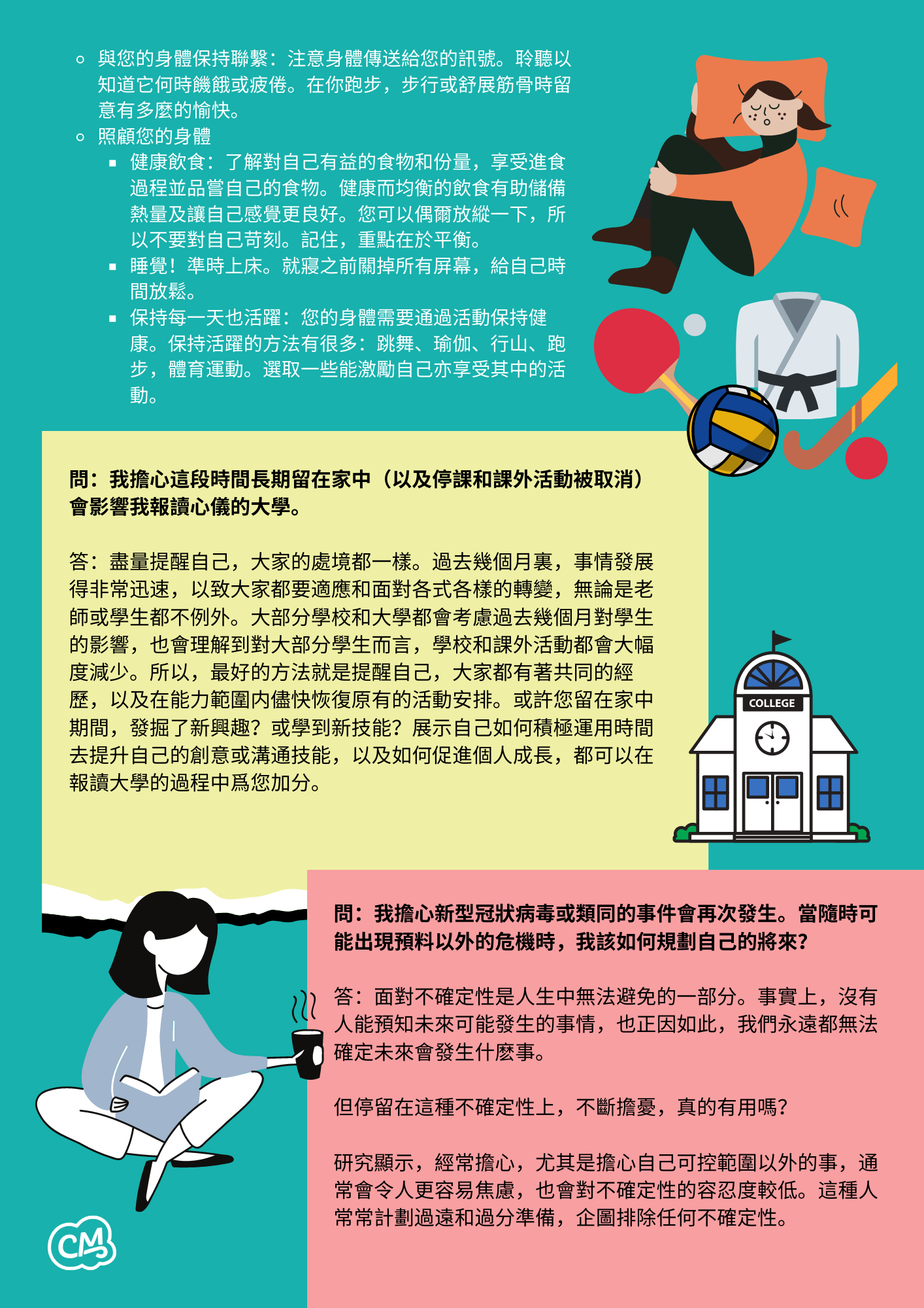 問:我擔⼼重返校園會令我⽣病,甚⾄感染新型冠狀病毒。社會仍可能出現輸⼊個案,加上我的⽗⺟也不斷在討論這情況,這些都使我感到很⼤壓⼒。