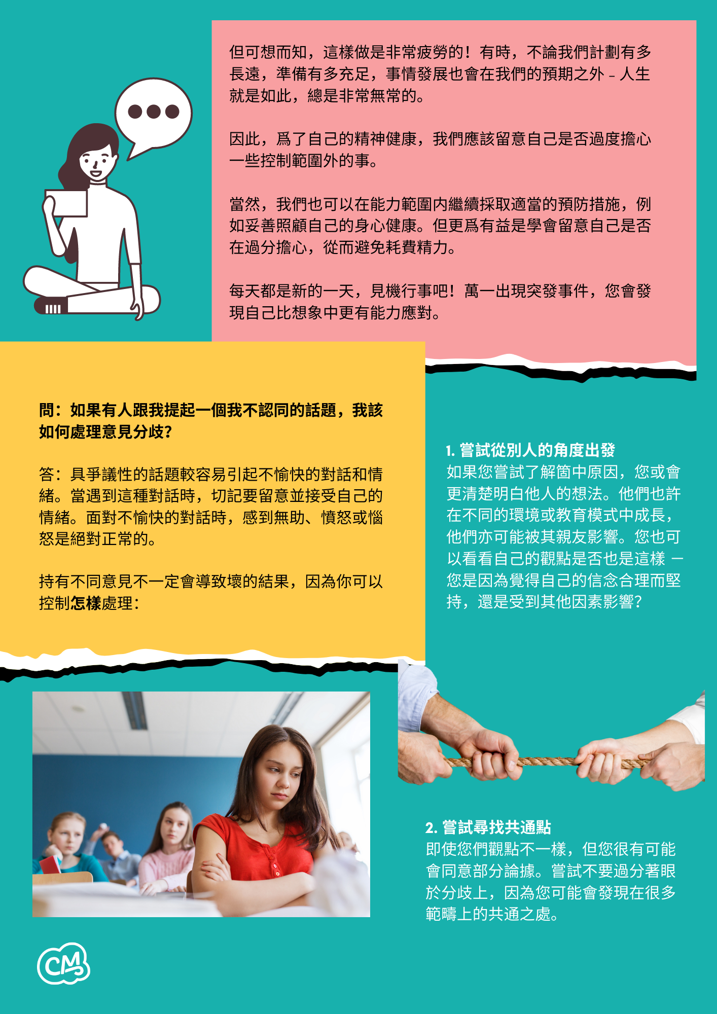 如果您嘗試了解箇中原因,您或會更清楚明⽩他⼈的想法。他們也許在不同的環境或教育模式中成⻑, 他們亦可能被其親友影響。您也可以看看⾃⼰的觀點是否也是這樣 − 您是因為覺得⾃⼰的信念合理⽽堅持,還是受到其他因素影響?