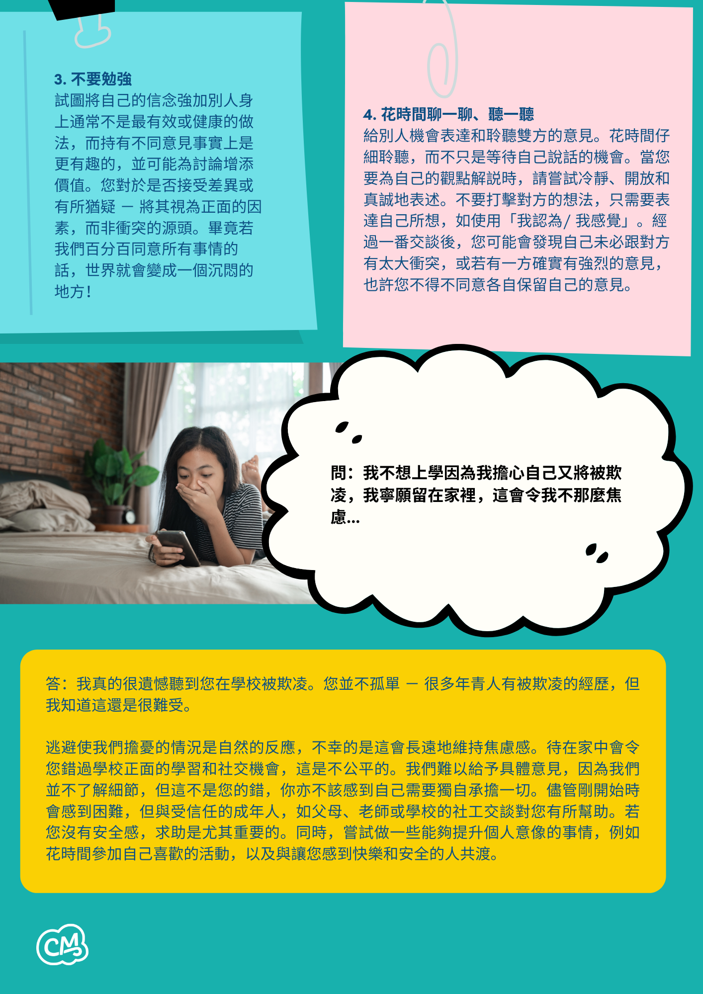 問:我不想上學因為我擔⼼⾃⼰⼜將被欺凌,我寧願留在家裡,這會令我不那麼焦慮…