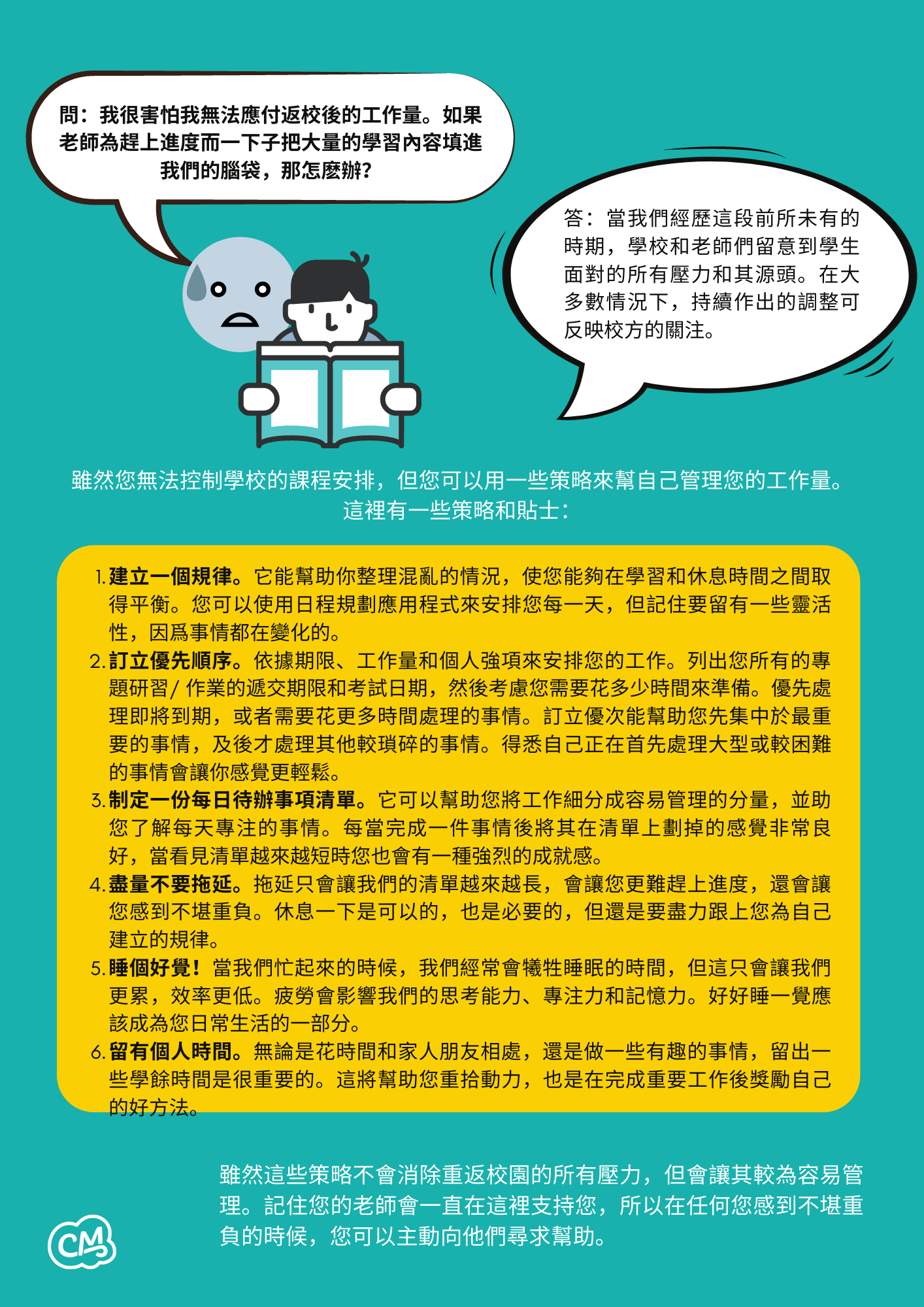 問:我很害怕我無法應付返校後的⼯作量。如果⽼師為趕上進度⽽⼀下⼦把⼤量的學習內容填進 我們的腦袋,那怎麽辦?