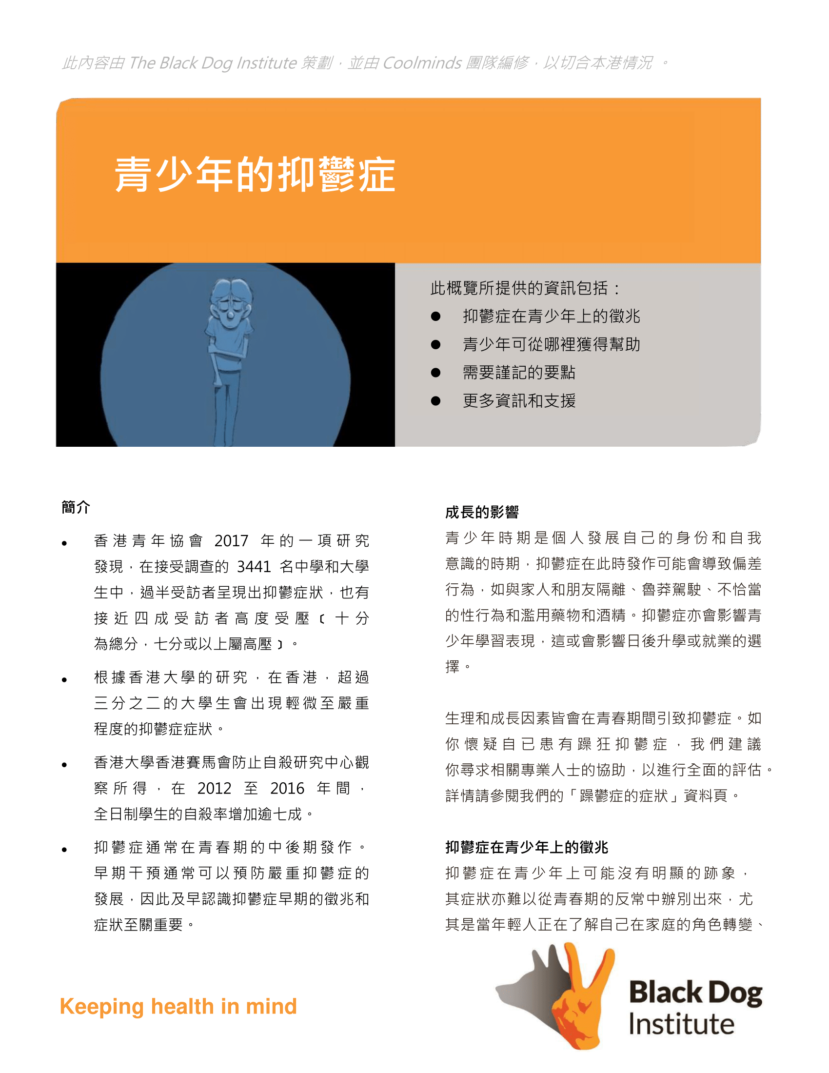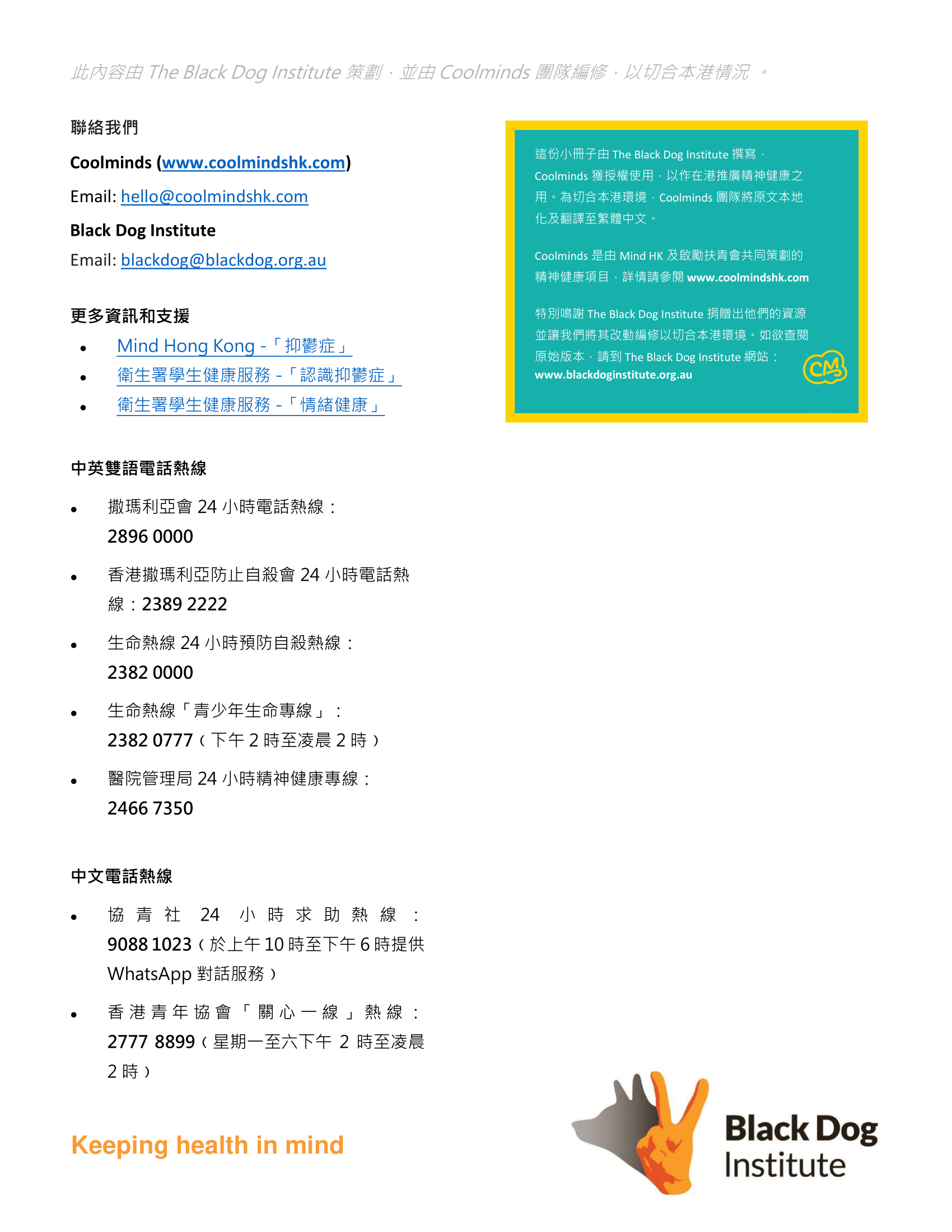 這份小冊子由 The Black Dog Institute 撰寫,Coolminds獲授權使用,以作在港推廣精神健康之用。為切合本港環境,Coolminds團隊將原文本地化及翻譯至繁體中文。