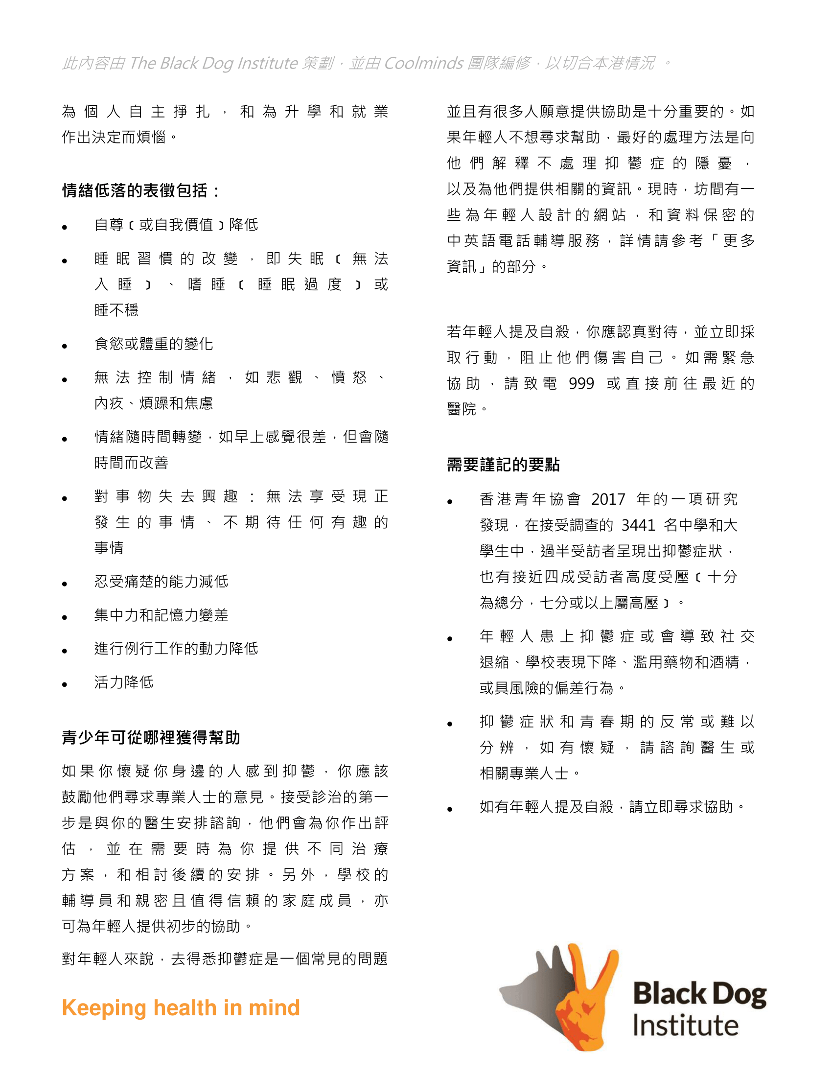 特別鳴謝 The Black Dog Institute 捐贈出他們的資源並讓我們將其改動編修以切合本港環境。如欲查閱原始版本,請到 The Black Dog Institute 網站:www.blackdoginstitute.org.au